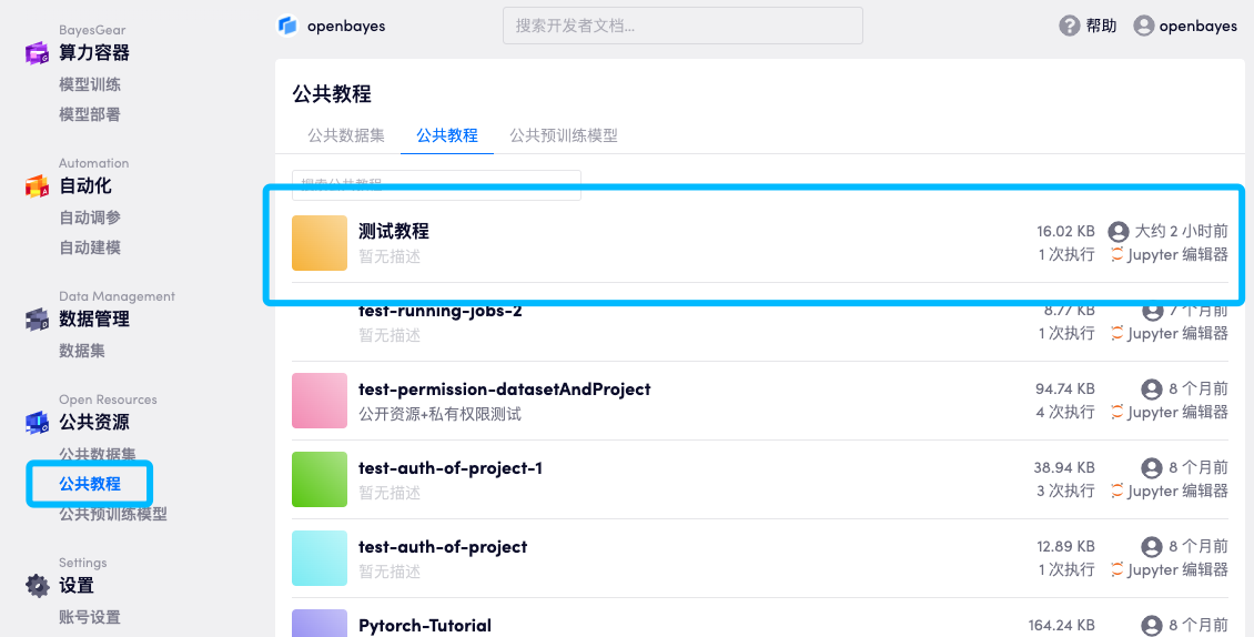 公开教程通常是指可以执行的代码、Jupyter 工作空间的集合,对于 OpenBayes 账号来说,一个「公开教程」实际上就是一个关闭了的「容器的执行」。按照以下步骤可以创建一个公开教程。