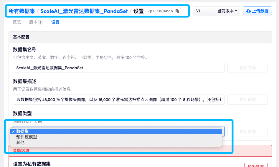 公开数据集以及公开预训练模型所展示的内容为 openbayes 账号下公开的 数据集 类型的数据以及 预训练模型 类型的数据。数据集的类型可以在其「设置」页面进行修改。