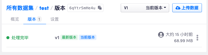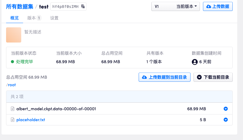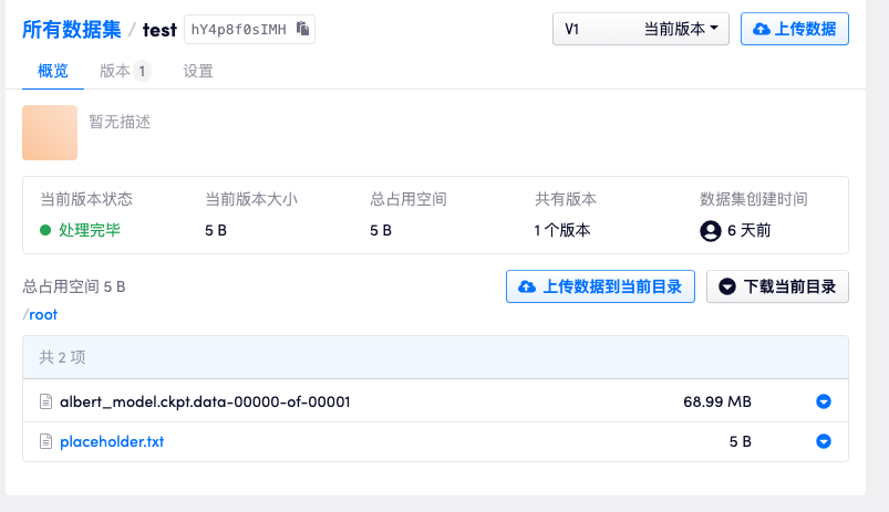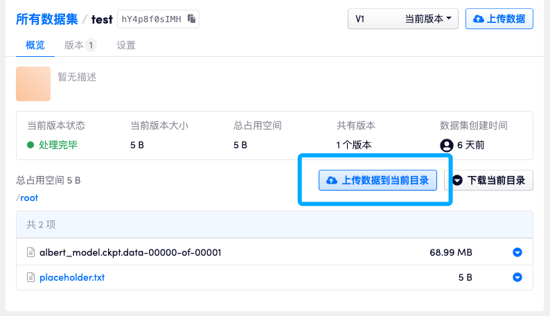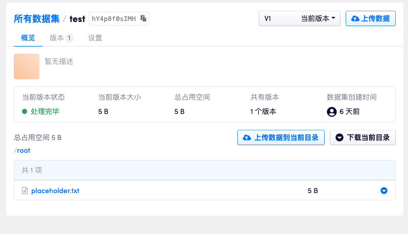 这里只上传一个名为 placeholder.txt 的文本文件,上传成功后数据集下生成一个新的版本。