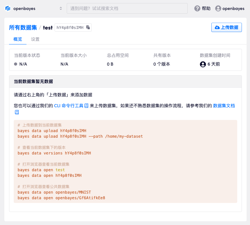 如上图所示,如果我希望将数据上传到 openbayess 账号下 id 为 hY4p8f0sIMH 的数据集下,首先我们可以先上传一个任意的小文件使其生成一个新的版本。