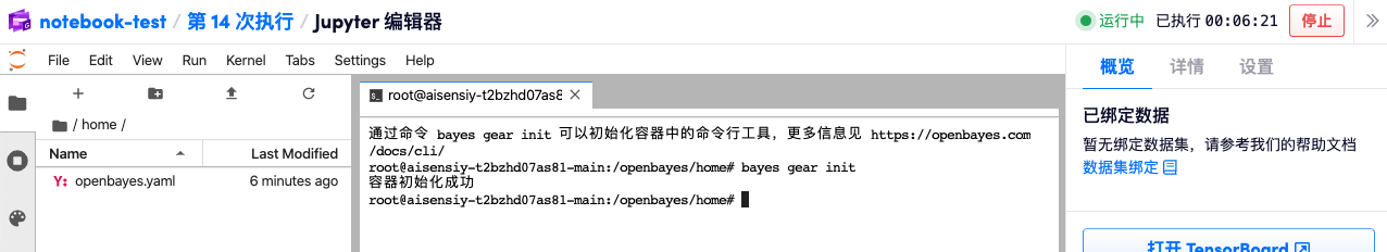 按照提示,执行命令 bayes ssh init 增加 ssh 配置,方便通过 ssh 访问容器。更多信息见 通过 SSH 连接运行中的 Jupyter 执行。