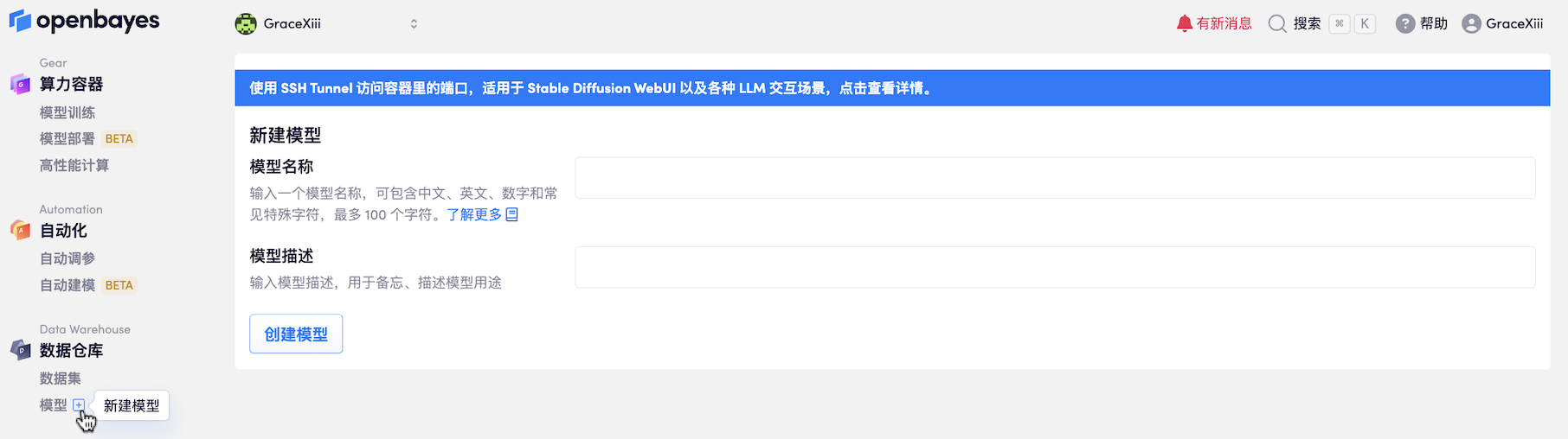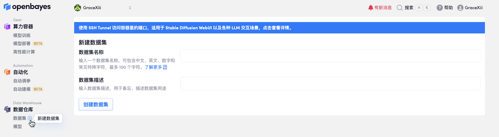之前「数据仓库」被称作「数据集」,这更容易被理解为机器学习场景下的标注数据,而实际上这里除了放置标注数据外也可以放置其他任意类型的数据,包括代码、训练的模型文件等。为了避免这个歧义,也是为新的「模型部署」功能做准备,OpenBayes 对原有的「数据集」概念做了调整,将「数据集」改称作「数据仓库」