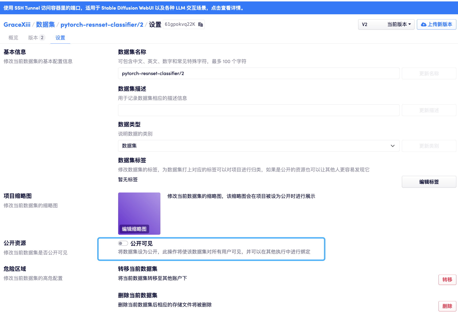 每个人可以创建的「公开数据仓库」的个数是有限的,其限制可以在「资源使用状况」-「配额限制」-「公有数据集」查看。