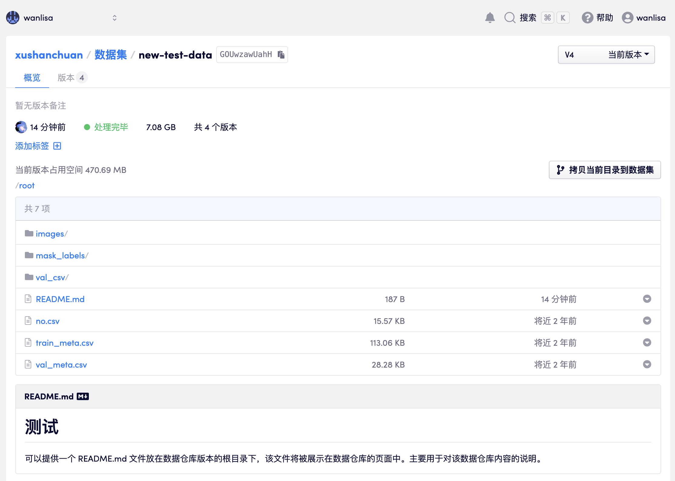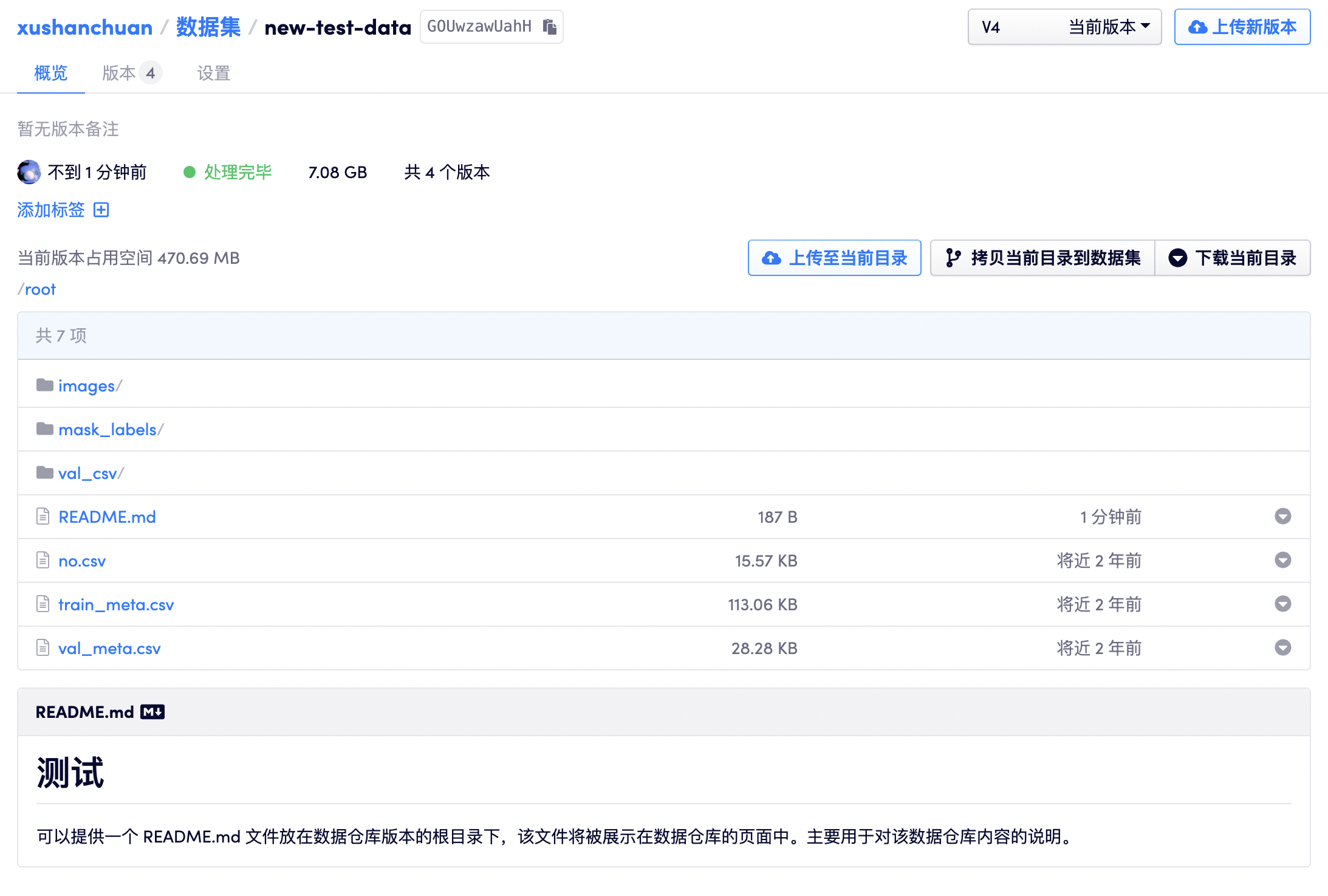 在拷贝或创建过程中新的数据集版本会标记为「正在拷贝数据」状态,完成拷贝后数据集版本会标记为「处理完毕」,即可使用。