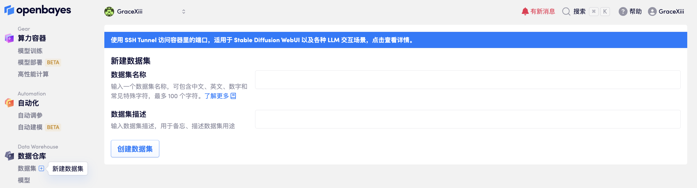 点击左侧菜单栏「数据集」后的「+」,输入数据集名称和描述,即可创建一个空数据集。