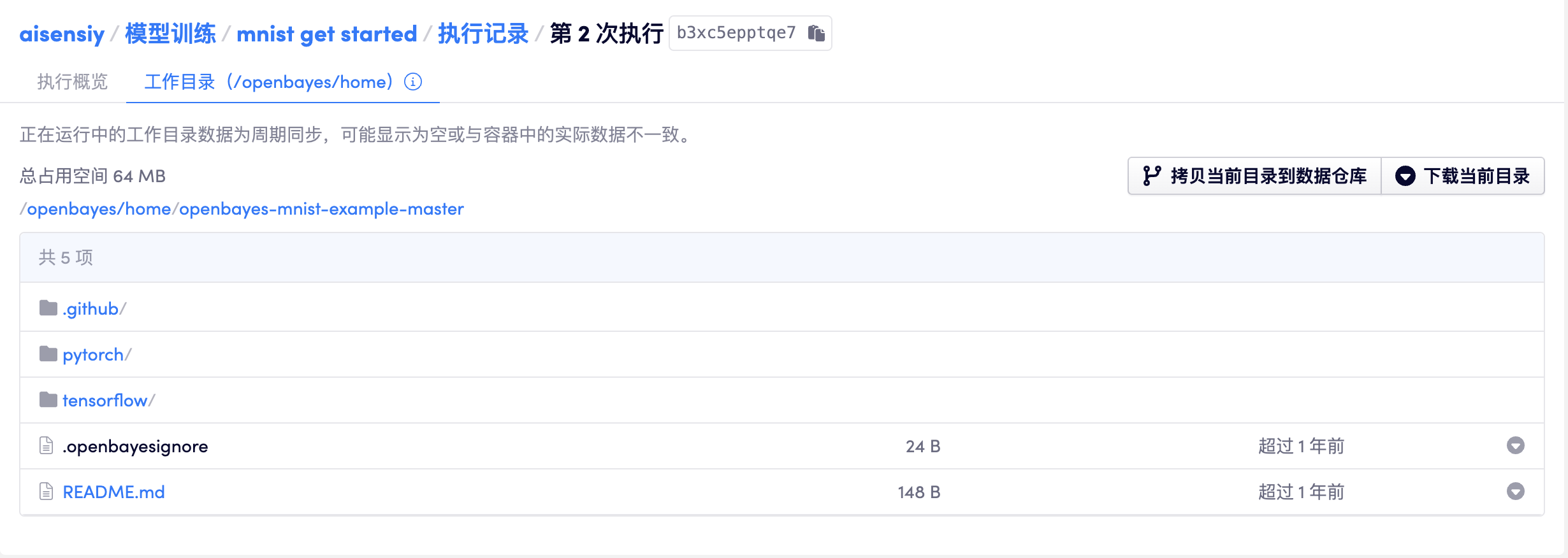 每次「执行」开始运行之后其运行时环境都会绑定其目录 /openbayes/home,作为容器的「工作目录」。该目录下的内容会在「执行」关闭后被保存下来,并可以通过页面中的「工作目录」选项卡查看。
