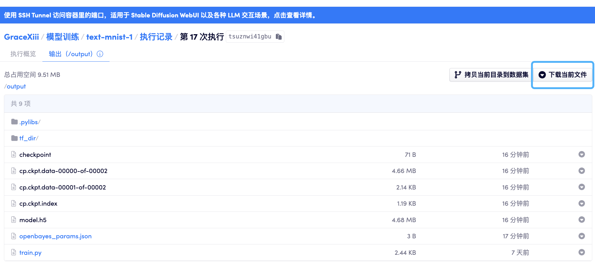 - 对于依然在运行的「Jupyter 工作空间」,可以直接在编辑器中查看或者下载,也可以在「容器页面」的「工作目录」选项卡查看,但是**「工作目录」选项卡的内容是周期性从运行中的「执行」里同步**的,因此运行中的「执行」其「工作目录」选项卡中的文件内容可能不是最新的数据