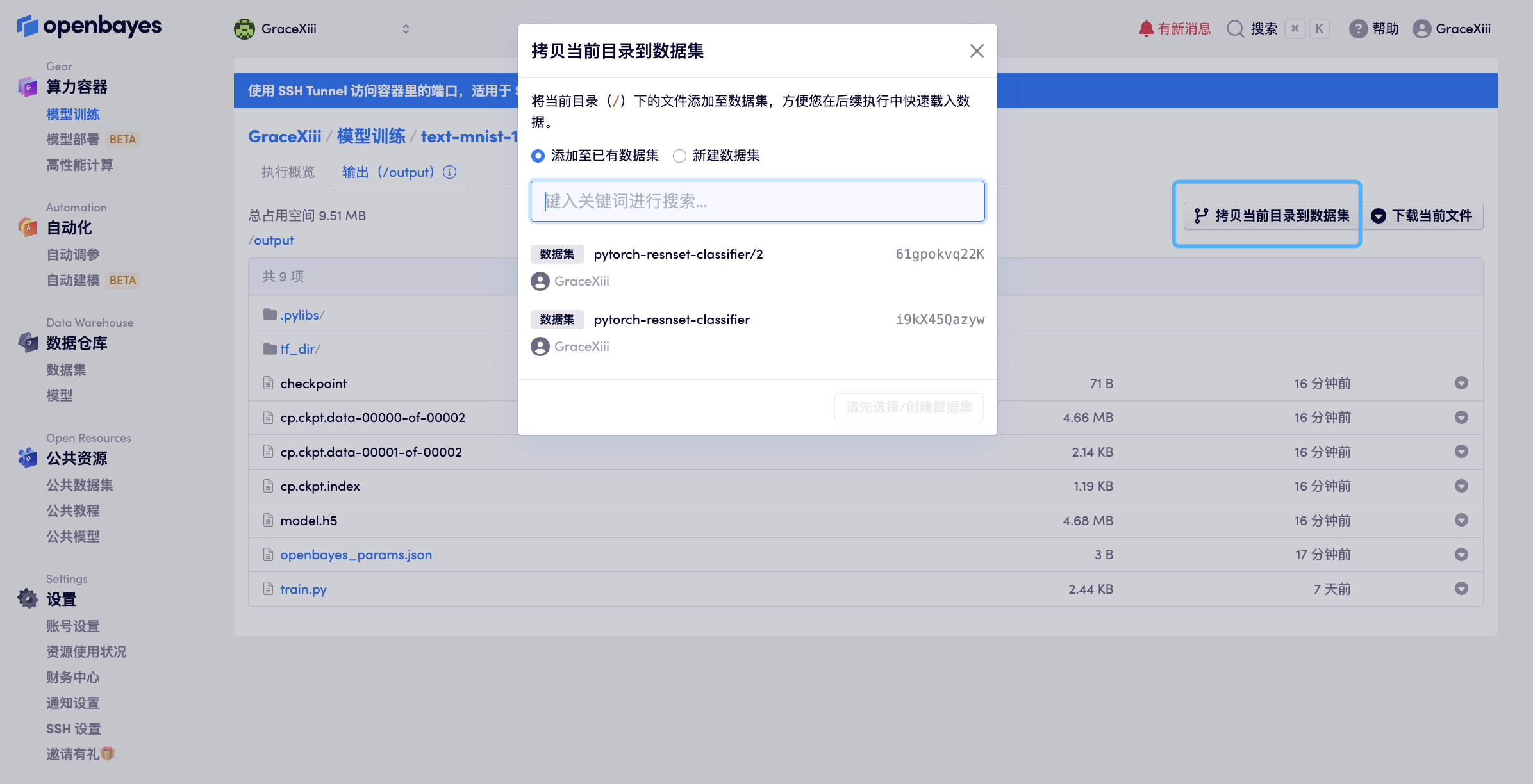 目前容器支持将「工作目录」或者其中的一个文件夹创建为数据仓库的一个新的版本,这样就可以把「工作目录」中产生的模型或者清理后的数据单独管理起来,方便未来的使用。