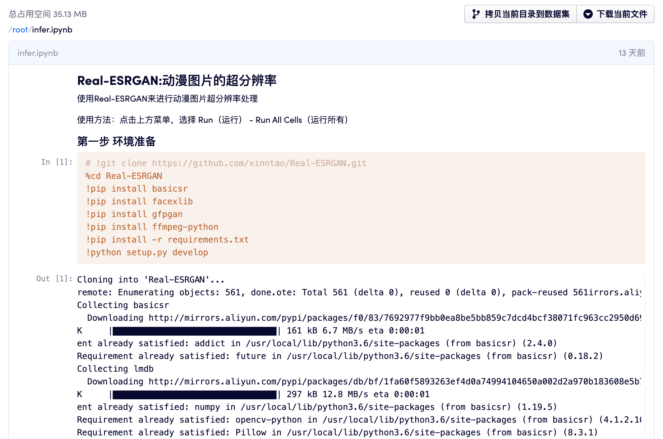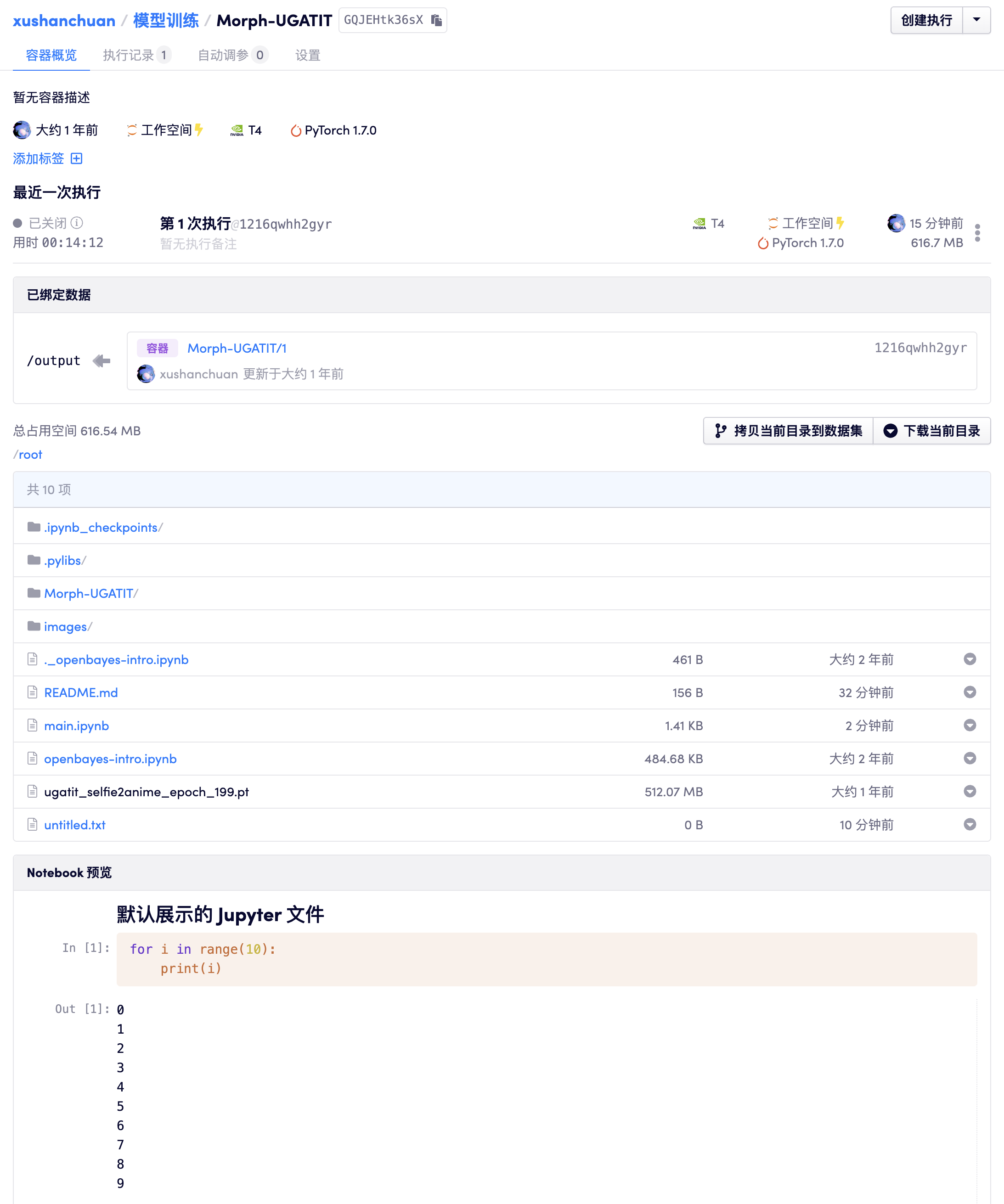 和上面展示 README.md 的逻辑类似,容器在关闭后会自动查找 /openbayes/home 目录下的 .ipynb 文件,并将其内容展示在容器的页面中。