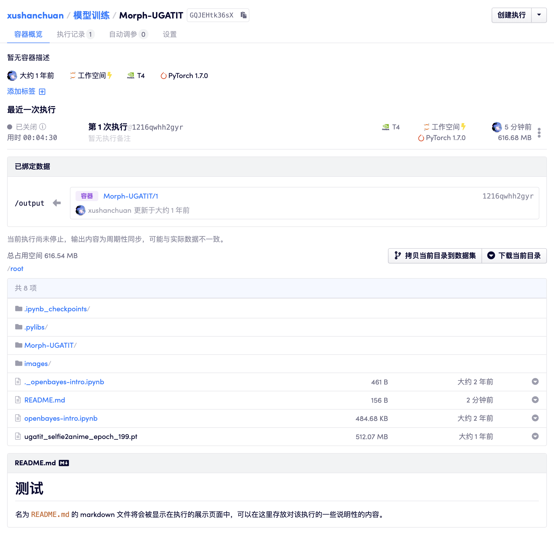 容器在关闭后会自动查找 /openbayes/home/README.md 文件,并将其内容展示在容器的页面中,该文件需要遵循 markdown 语法。