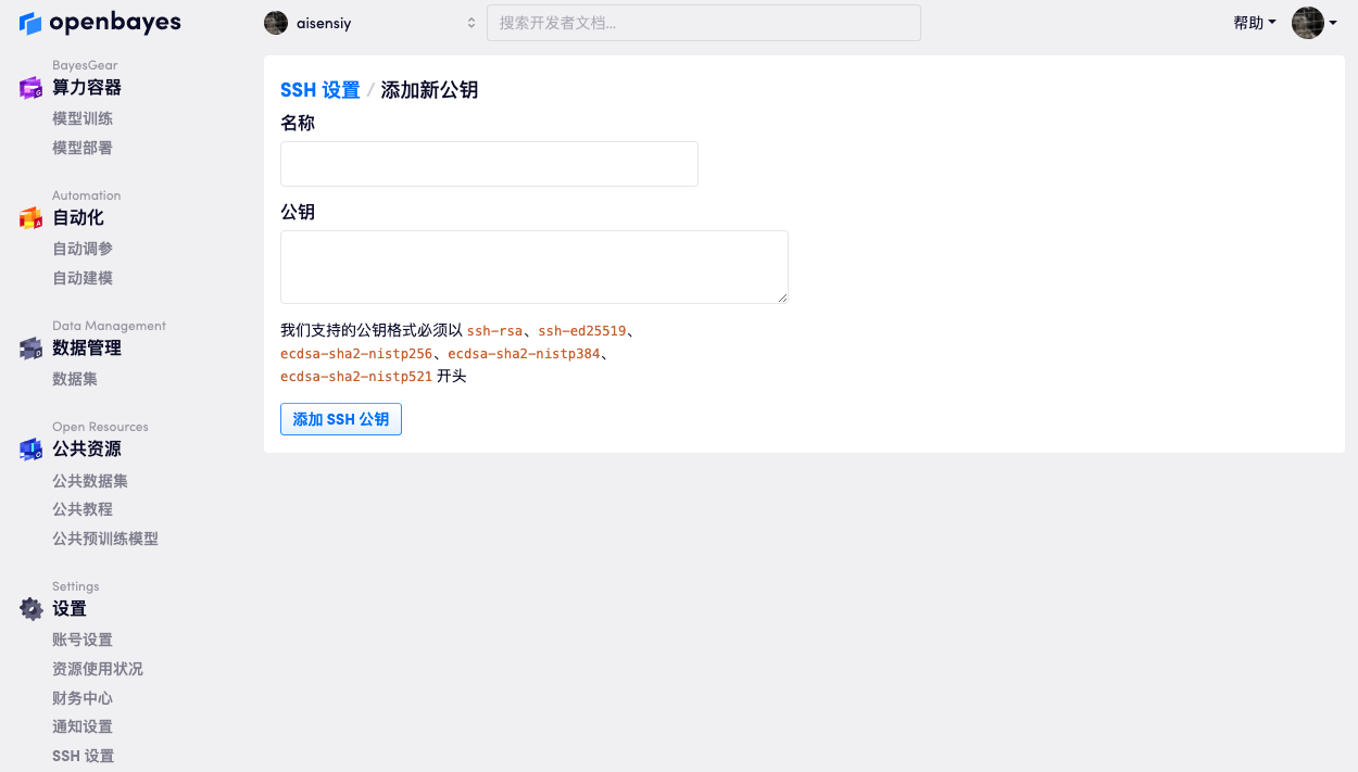 ~/.ssh目录(Windows 下为用户目录的.ssh目录),用编辑器打开id_rsa.pub文件(此处是生成公钥的默认名称,如果生成公钥时采用了其他名称,打开相对应的文件即可),复制全部内容。 - 登录 OpenBayes 页面,在界面左侧导航栏点击「SSH 设置」->「添加新公钥」,将内容粘贴到「公钥」的文本框里并给自己的这个 SSH 公钥起个名字,点击添加 SSH 公钥即可。