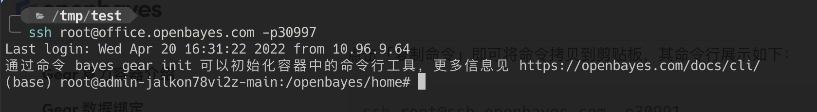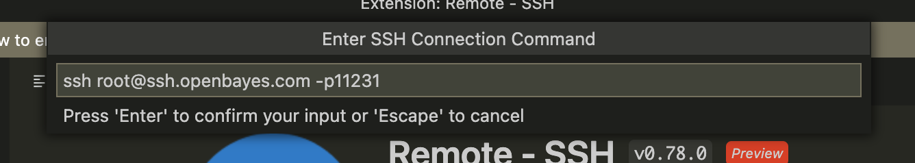 其中 root 为用户名,ssh.openbayes.com 为服务器地址,可能是 IP 也可能是 openbayes 所指定的其他域名,30360 为端口号。
