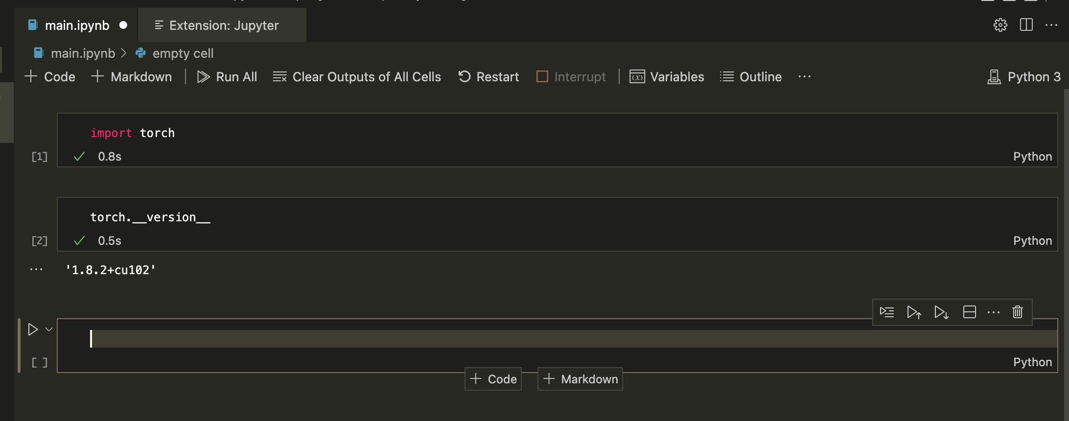 安装完成后回到刚才的 main.ipynb 页面,发现右上角已经选择了默认的 kernel 了,并且可以执行 python 命令了。