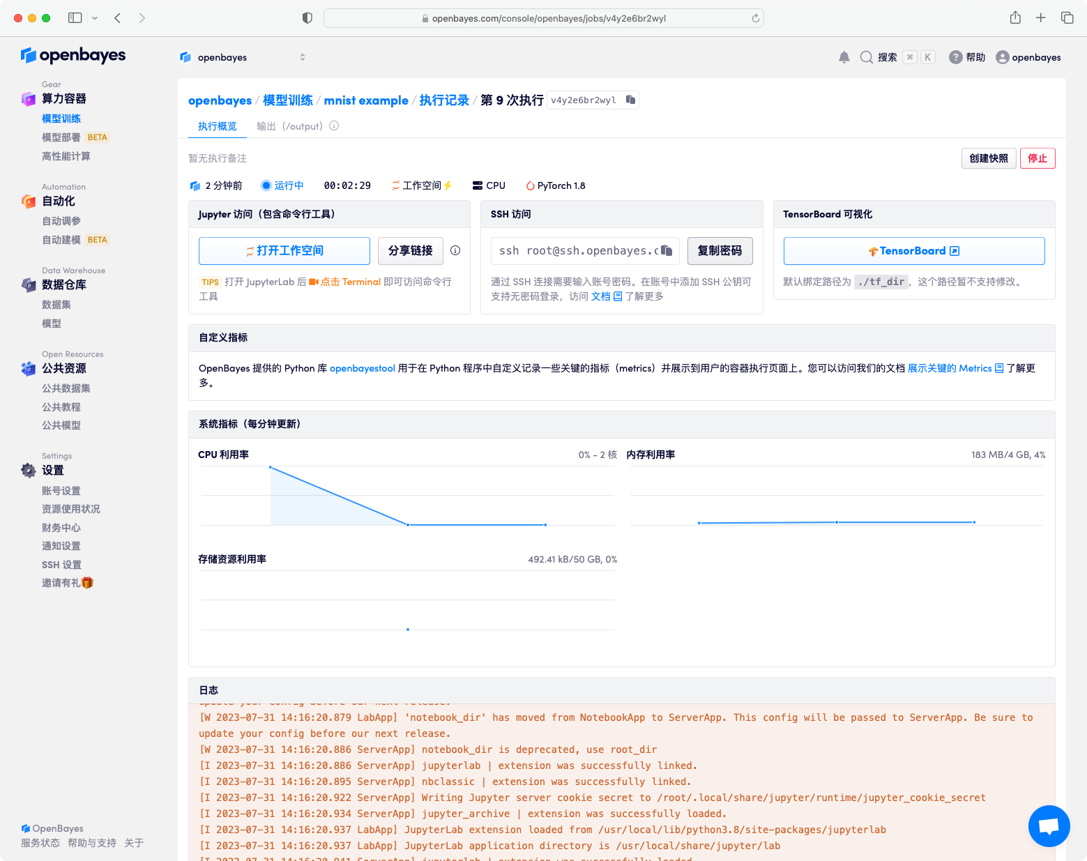 OpenBayes 支持通过 SSH 协议来访问运行中的 Jupyter 类型的执行。有两种通过 SSH 访问机器的验证方式: