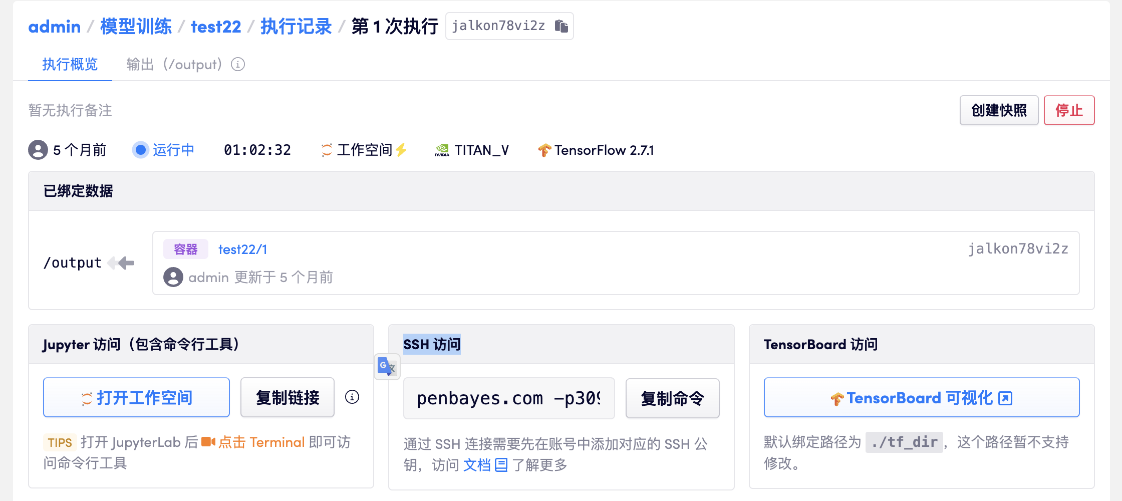 在启动「工作空间」后,其页面会展示 ssh 登录信息,如下图所示: