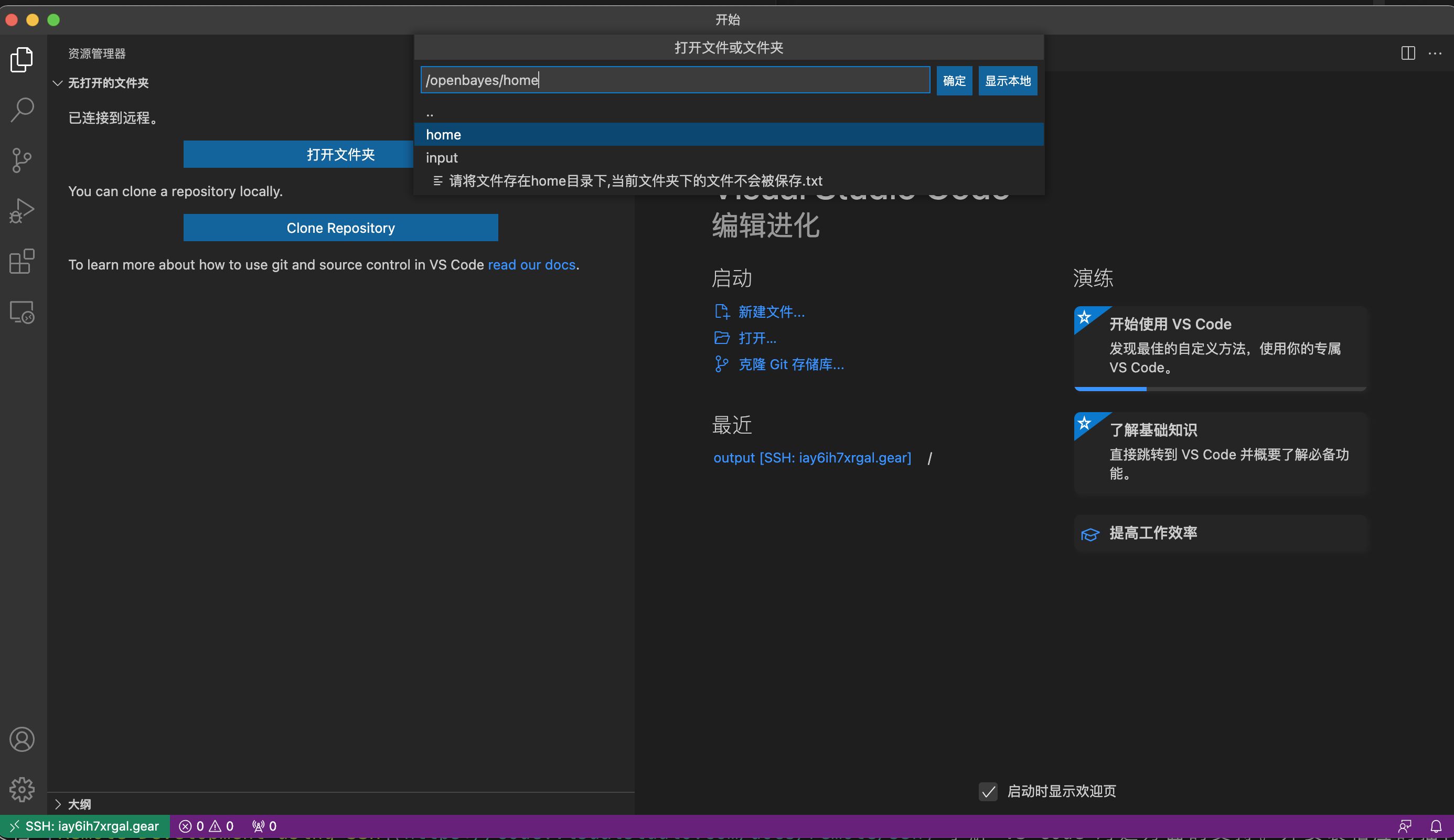 VS Code 会弹出一个新的窗口并提示连接成功了。目前其所指向的目录为 /root 而不是 OpenBayes 所默认使用的工作目录,点击左侧栏目中「打开文件夹」切换到 /openbayes/home 就可以看到目录中的内容了。