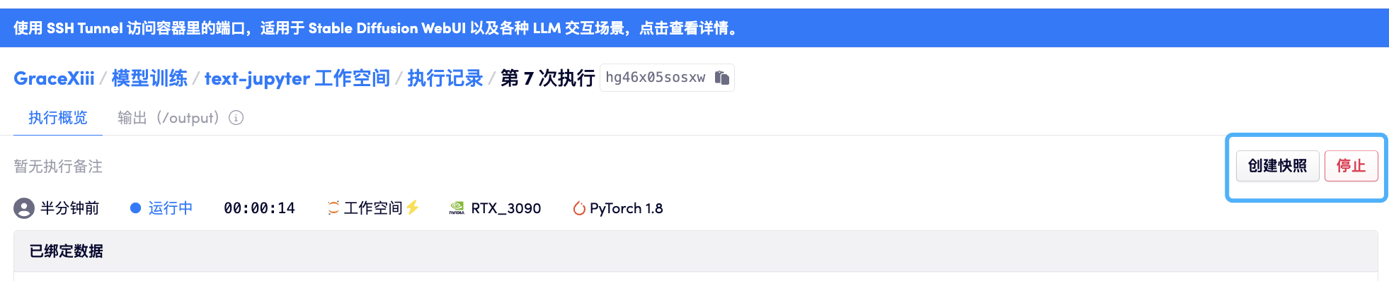 - 每次启动都会自动绑定之前的「工作目录」内容,同时允许对「算力」、「运行时环境」(镜像)、数据绑定(input 绑定)等配置做调整。