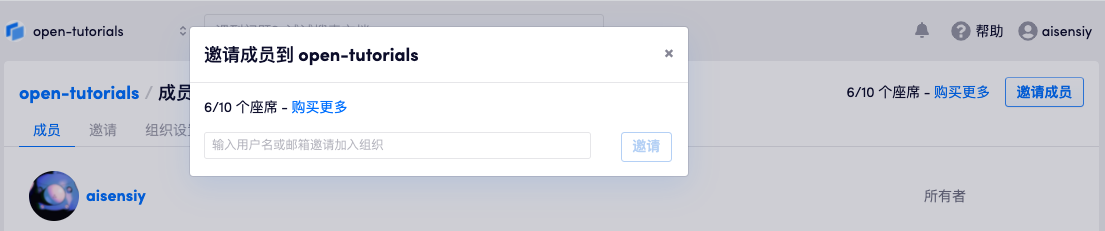 点击「邀请成员」可以将组织的成员邀请到组织中。
