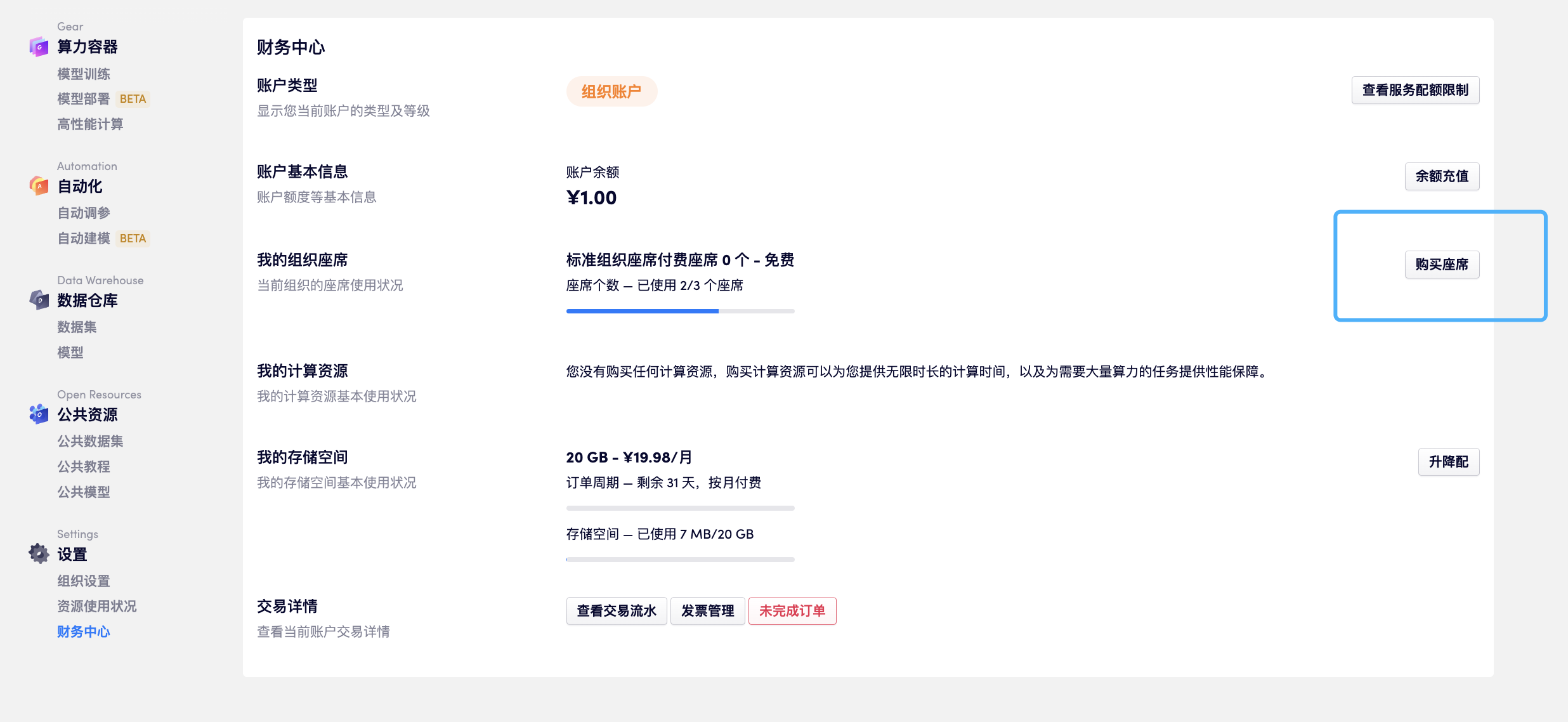 每个组织是独立的命名空间,这意味着「数据仓库」「算力容器」在组织下有独立的访问权限。同时,组织下的「存储」「计算资源」也是独立的。也就是说在组织下构建的任何资源都会使用组织的资源(存储、算力)而不是个人的资源。