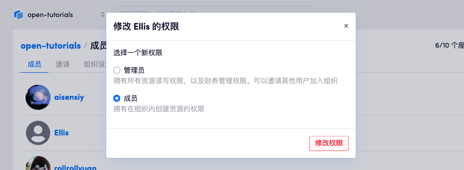 - 管理员,是组织的管理者,可以邀请新的成员加入组织,并对资源有更高的权限控制。