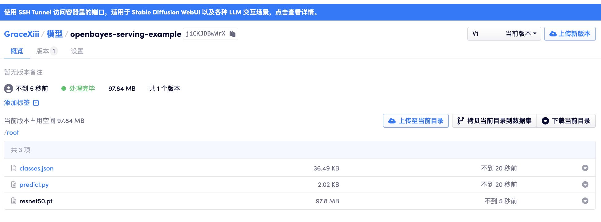 这里以 PyTorch ResNet50 为例,介绍一下模型部署的流程。所有的代码可以在 openbayes-serving-examples/pytorch/image-classifier-resnet50/ 获取。