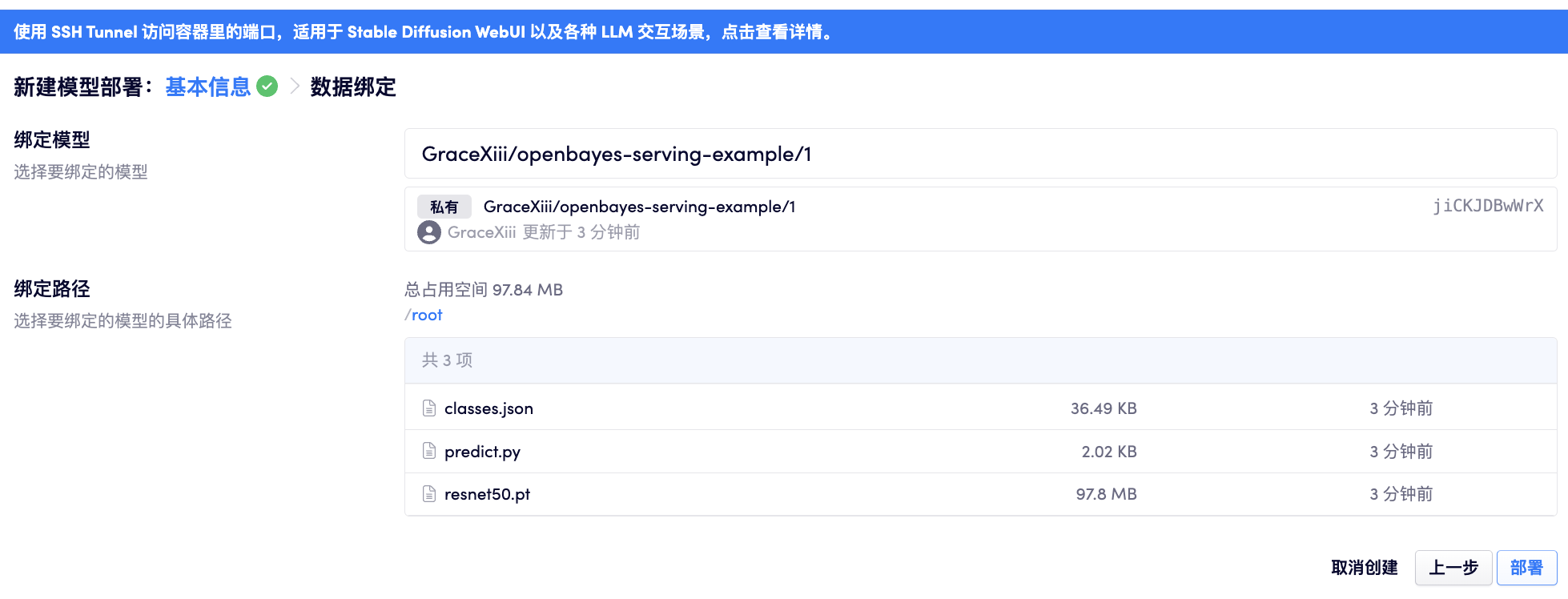 resnet50.pt为模型文件。predictor.py目前 OpenBayes 模型部署要求其文件名称固定为predictor.py使用其他的文件名将会导致部署失败。classes.json包含 resnet 分类的元数据,在展示分类的名称时使用。
