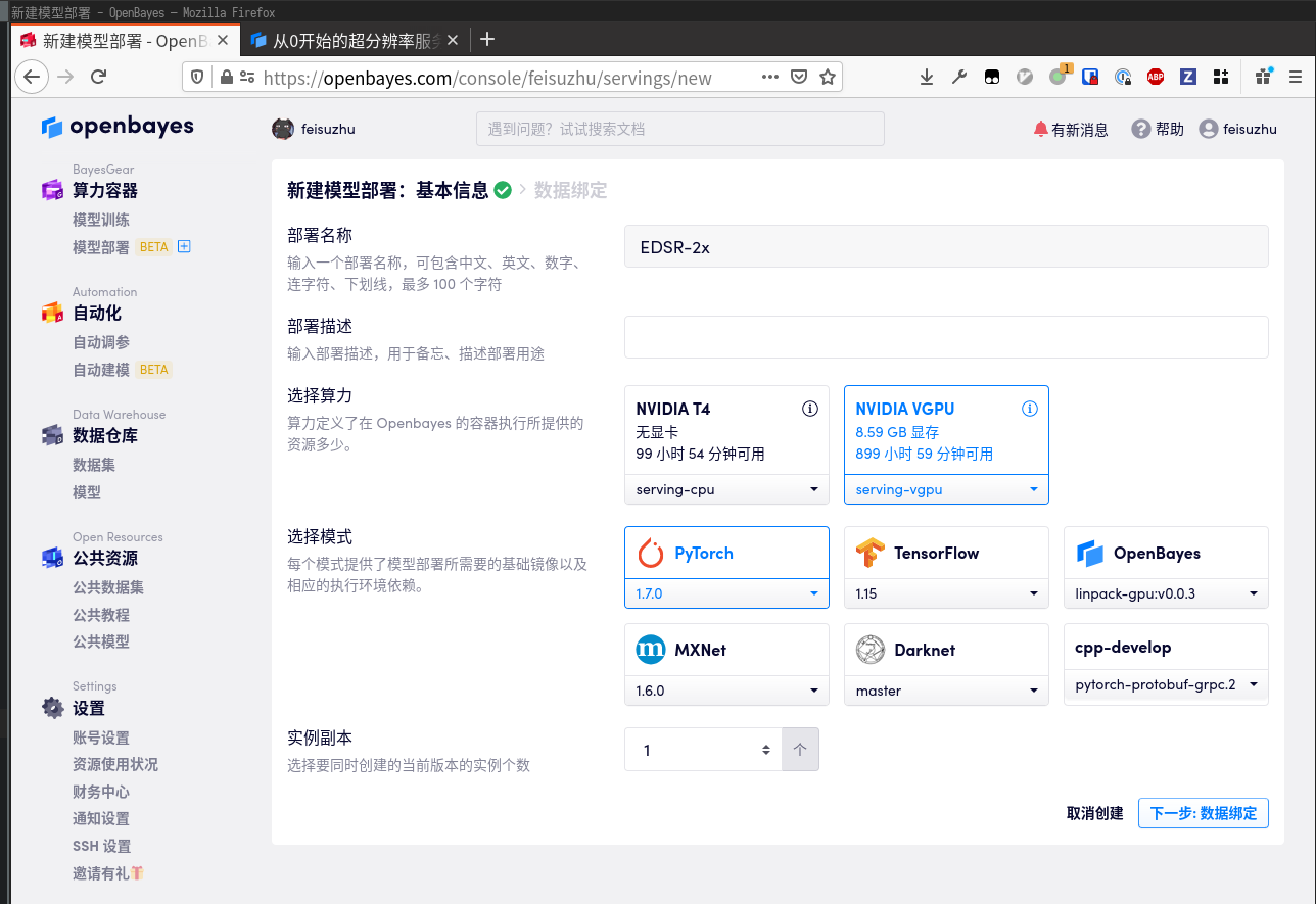 然后找到「算力容器」下的「模型部署」,点击「创建新部署」,选择与开发时相同的镜像,并选择一个 GPU 算力。