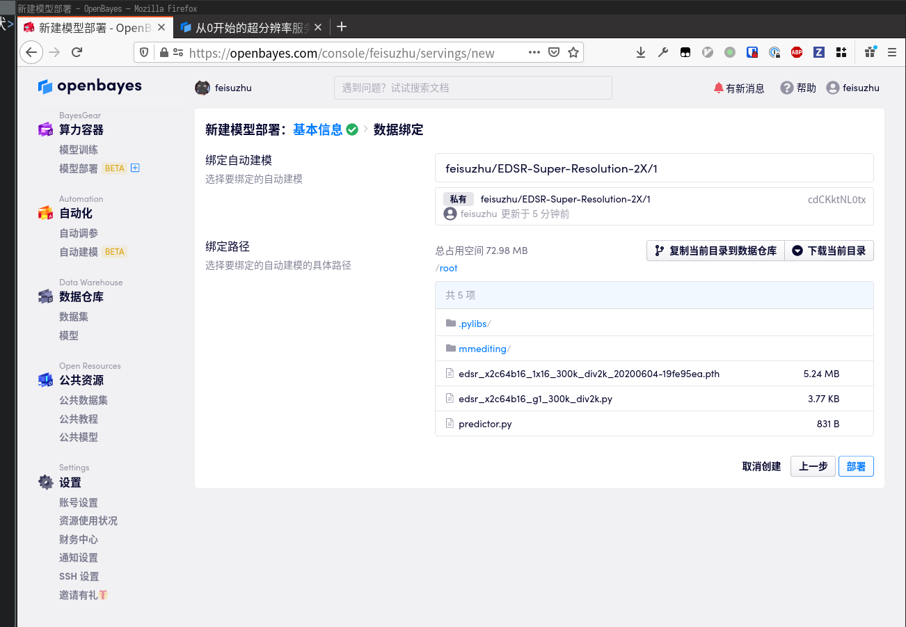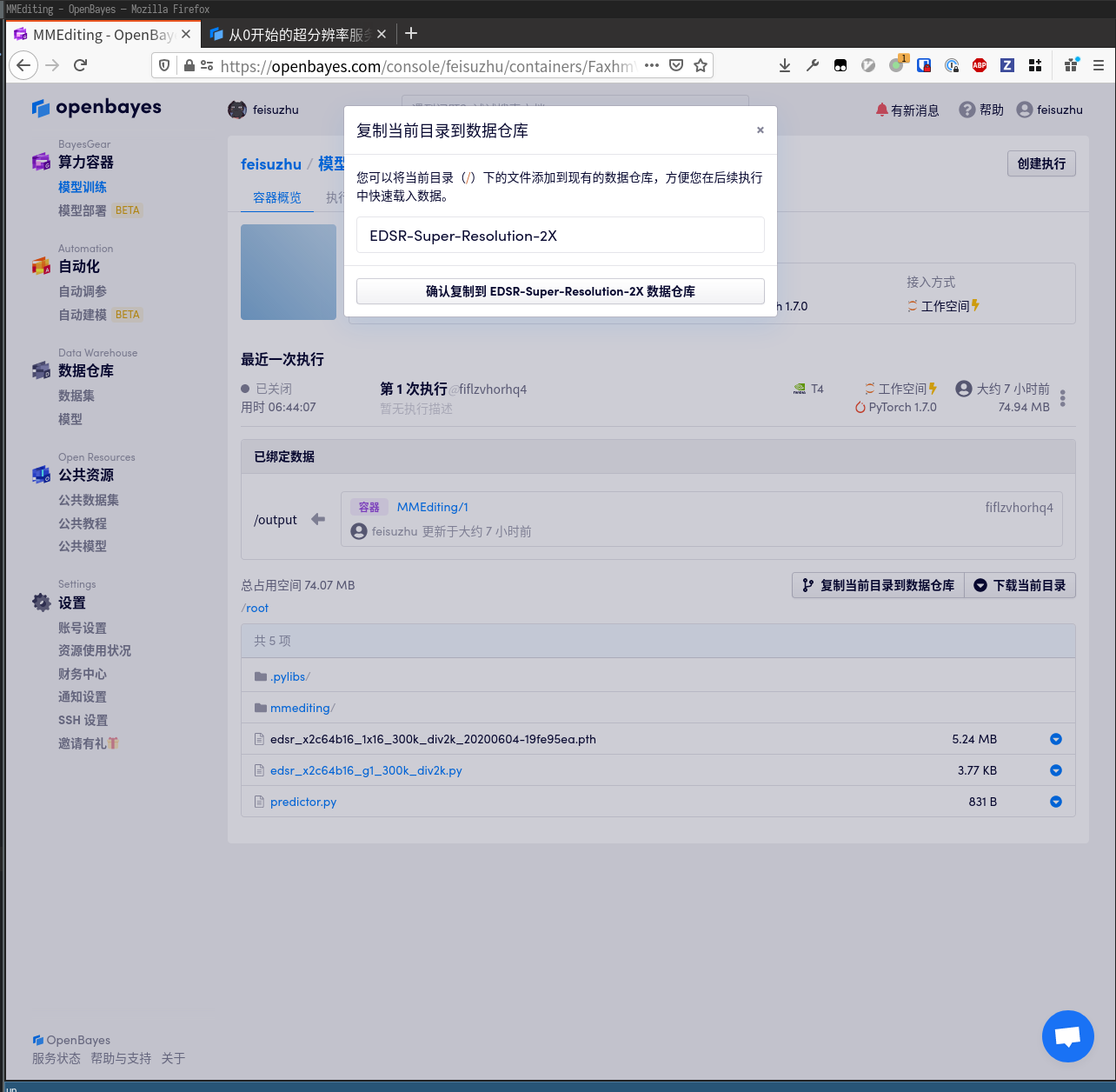 然后我们在文档的 Model Zoo/Restration Models 找到了预训练的 EDSR 模型,把配置和模型文件下载下来并上传到算力容器的 home 目录下(可以用 Jupyter 工作空间的上传按钮,也可以直接拖动到文件列表上)。