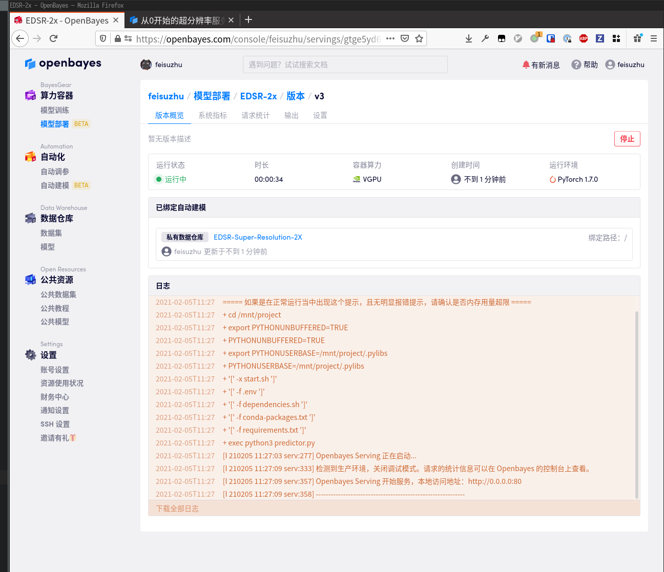 在依赖管理部分介绍的依赖安装会在「模型部署」启动时执行,为了加速服务的启动可以通过使用自定义镜像,在自定义镜像中预装所有的依赖。