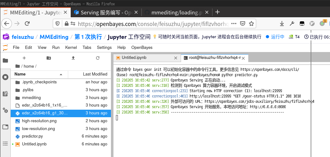 可以看到基本就是我们之前在 Notebook 中写的代码,填到了固定的框架中。将文件保存为 predictor.py,开启新的 Terminal 运行它。