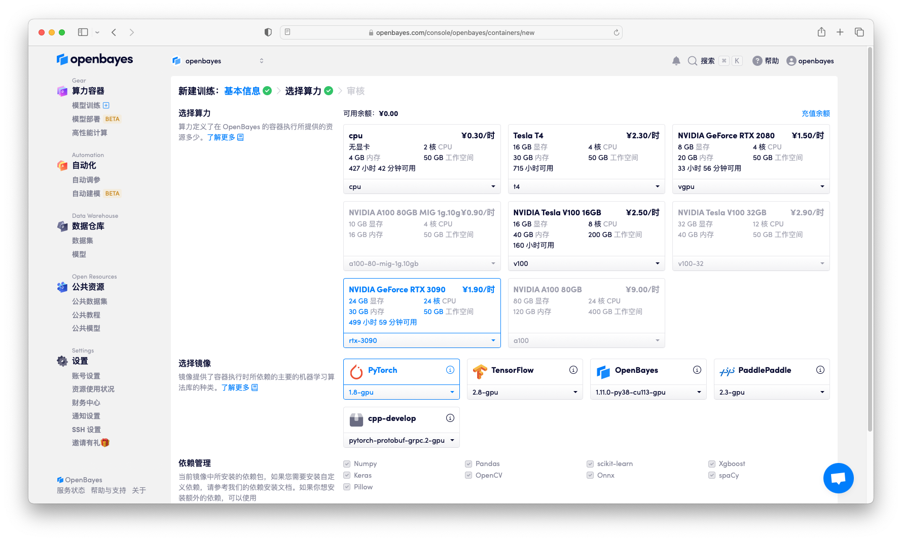 算力选择 CPU(如果有其他 GPU 类型,推荐选择 GPU 类型,速度会快很多),然后镜像选择「pytorch-1.8」,