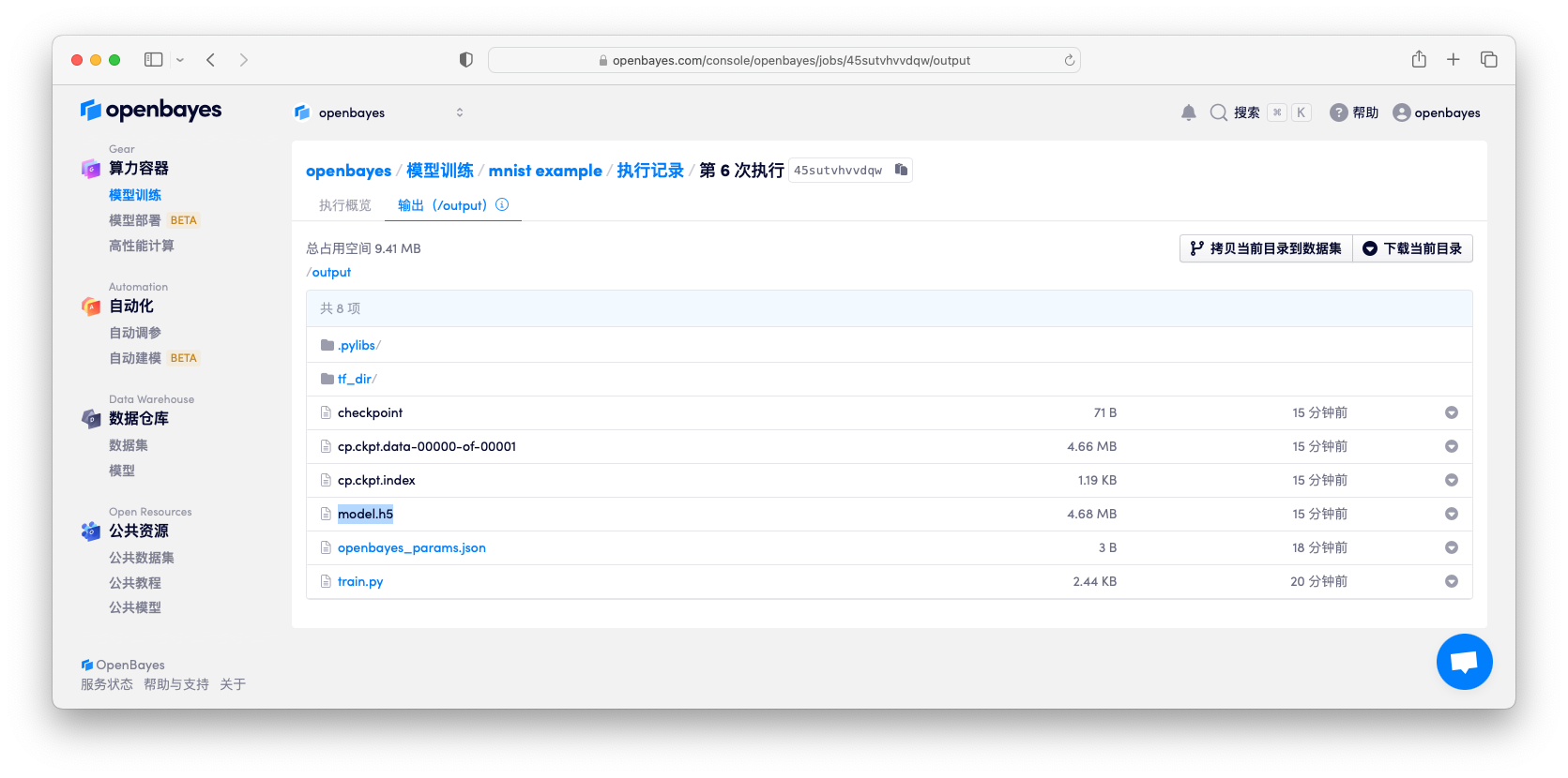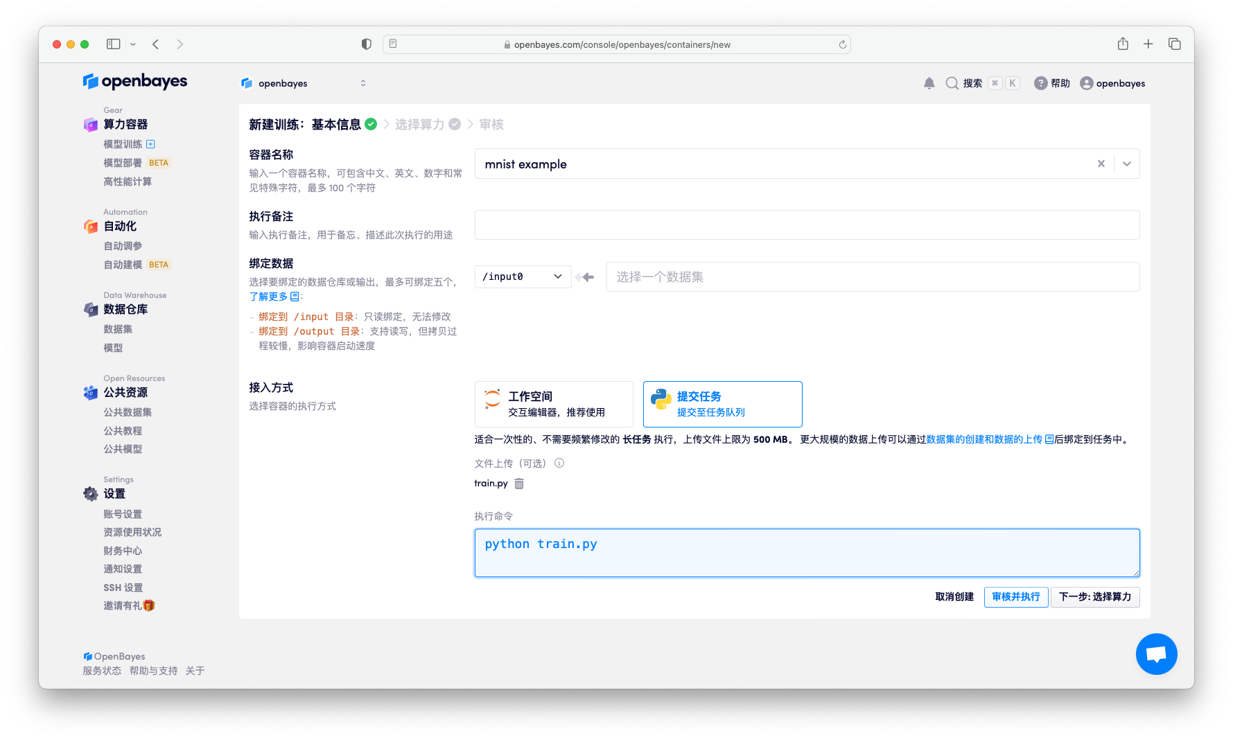 .py包含了执行机器学习模型训练和采用模型进行推断的代码openbayes.yaml包含了执行一个「Python 脚本执行」的配置,更多信息见 openbayes cli 配置文件
