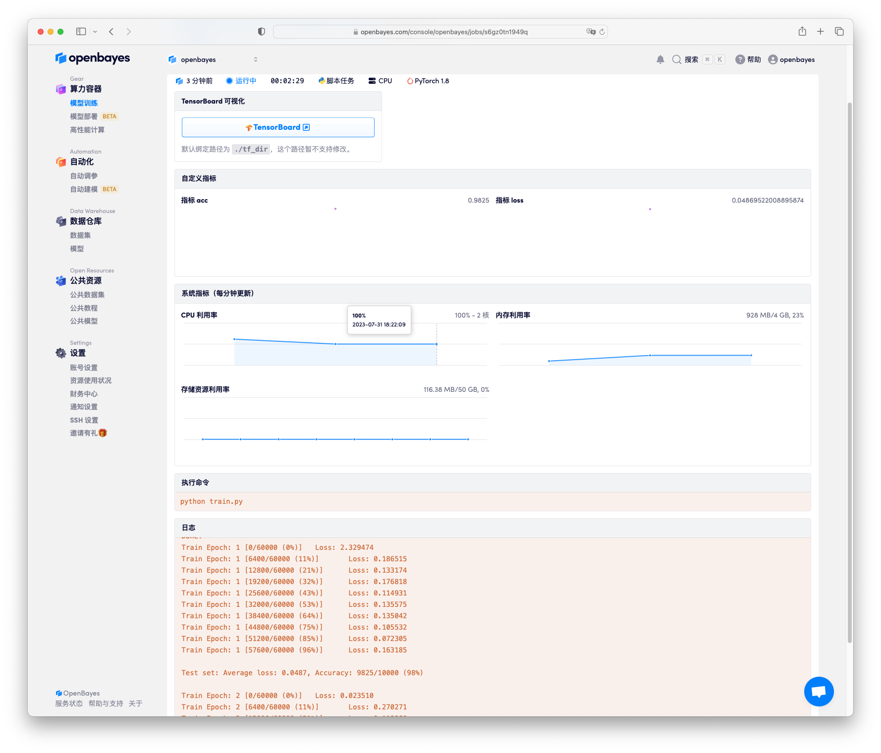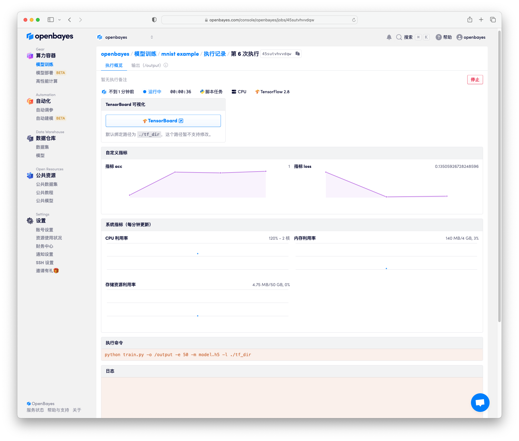 train.py为用于模型训练的 py 文件-o /openbayes/home指明所要保存的文件目录为/openbayes/home,在 Python 脚本执行模式下,系统会将/openbayes/home目录下的结果进行保存并上传,因此所有的工作目录结果都应保存在该目录下,其他目录下,甚至包含默认的 . 目录下的文件更新都将不会被保存-e 50指定了模型训练的epoch值-m model.h5指明的保存的模型的名称,当然结合-o /openbayes/home参数,最终的训练模型会存储到/openbayes/home/model.h5下-l ./tf_dir默认./tf_dir指向 OpenBayes 取 TensorBoard 的目录