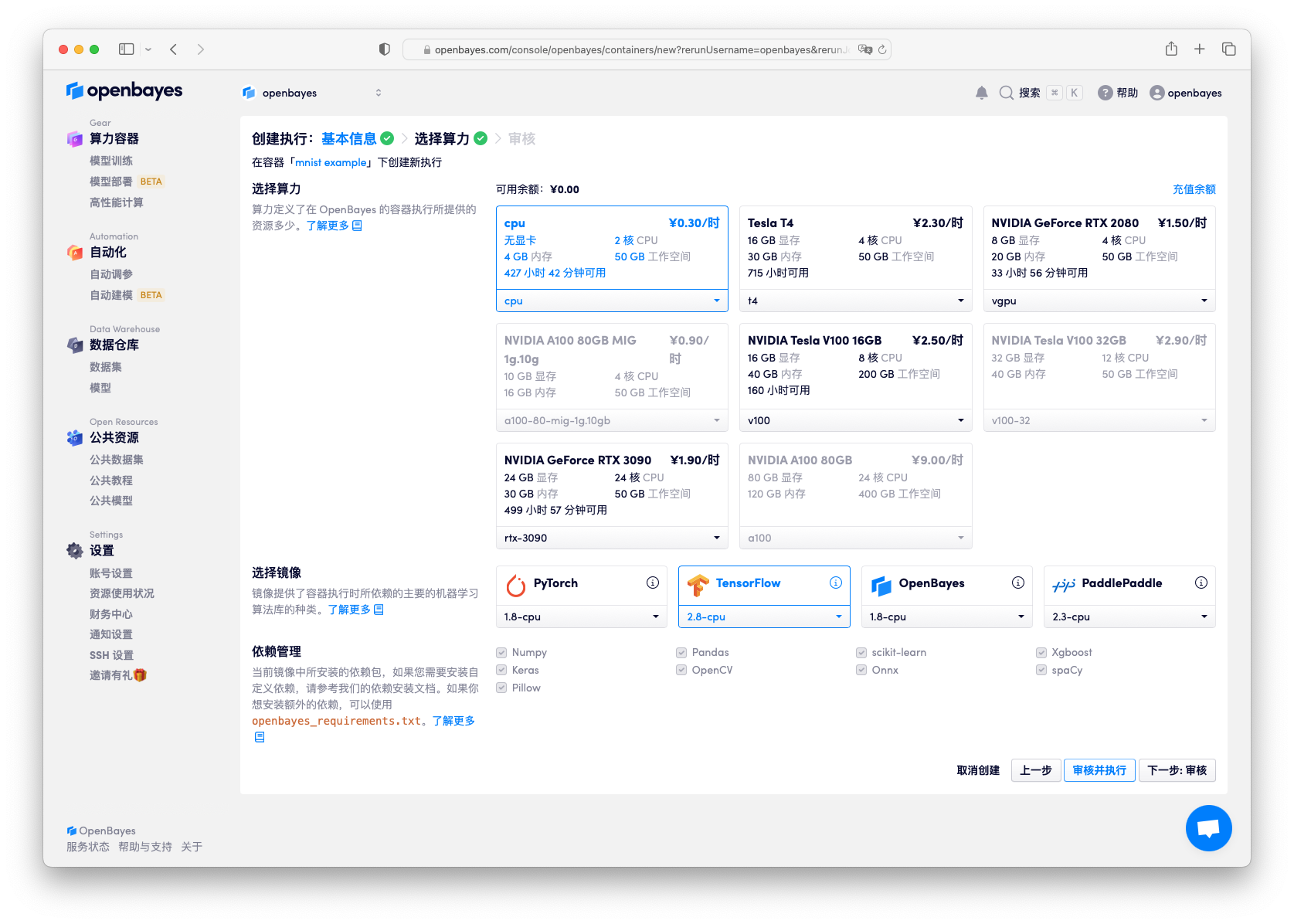 下一步算力选择 CPU,镜像选择 "tensorflow-2.8",接入方式选择「Python 脚本执行」,并将目录中 train.py 文件上传。