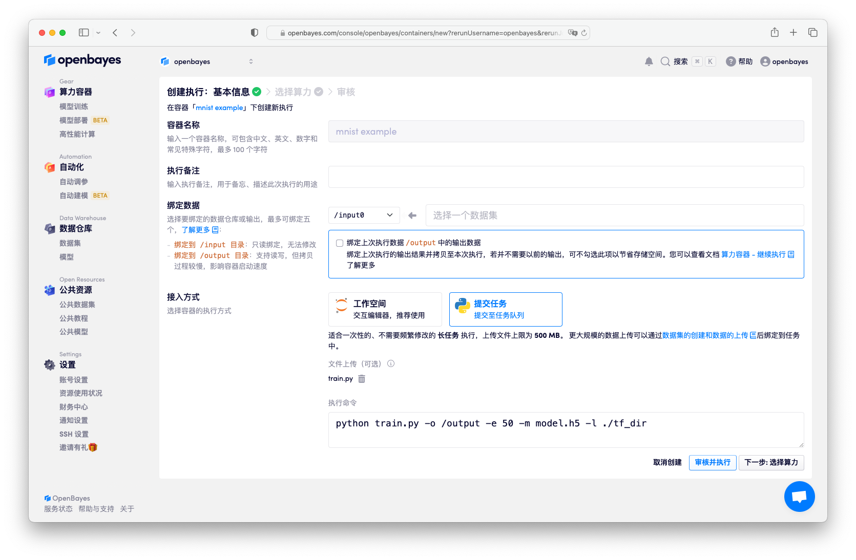 这里将上一次的「工作目录」的绑定指向 /openbayes/home。更多有关「继续执行」的细节见算力容器的继续执行。
