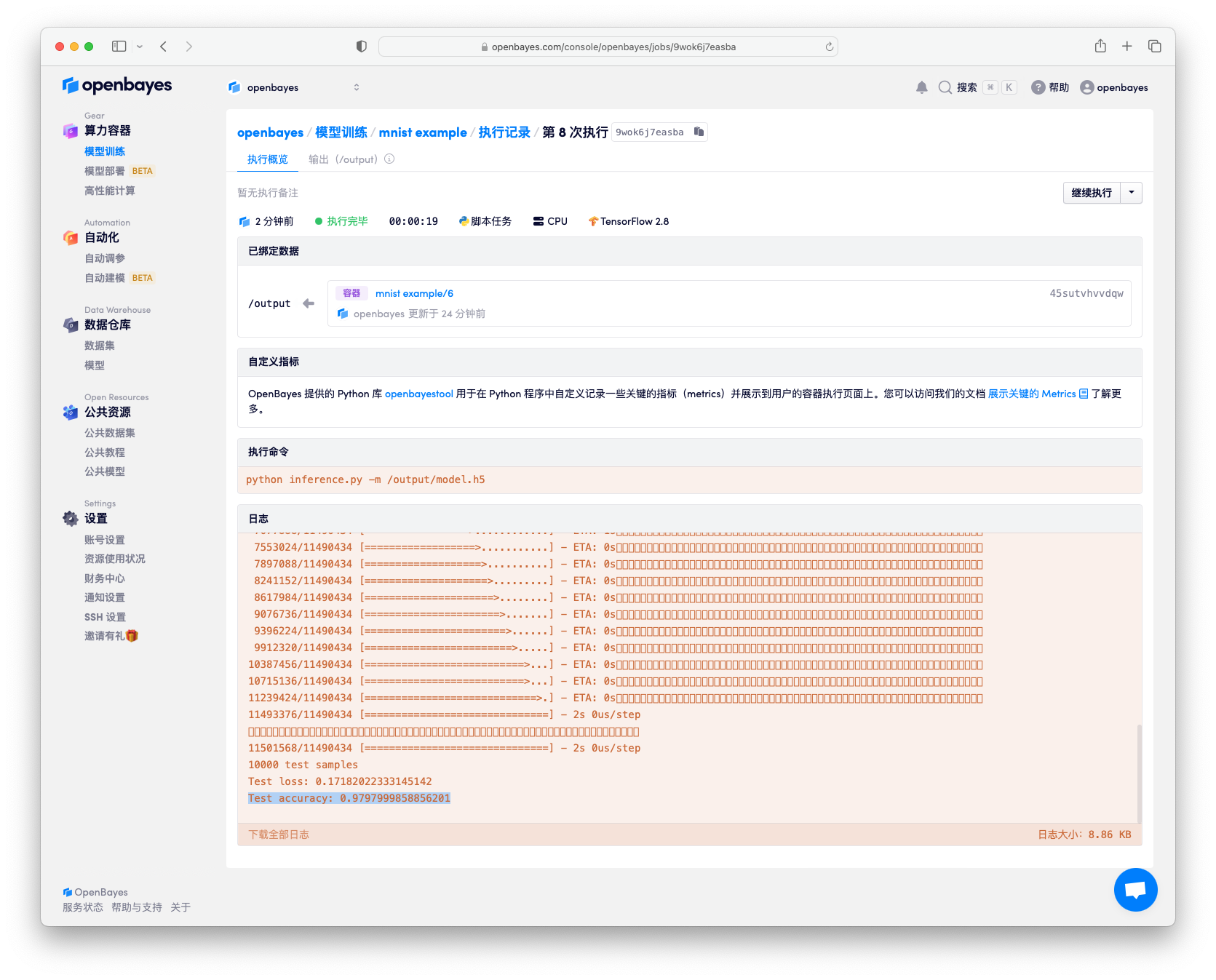其中 -m /openbayes/home/model.h5 指定需要载入的模型的目录。提交并执行完毕后,可以看到日志中展示了对 10000 测试结果获取了 98% 的准确率。