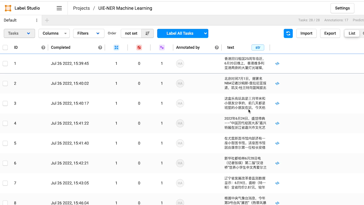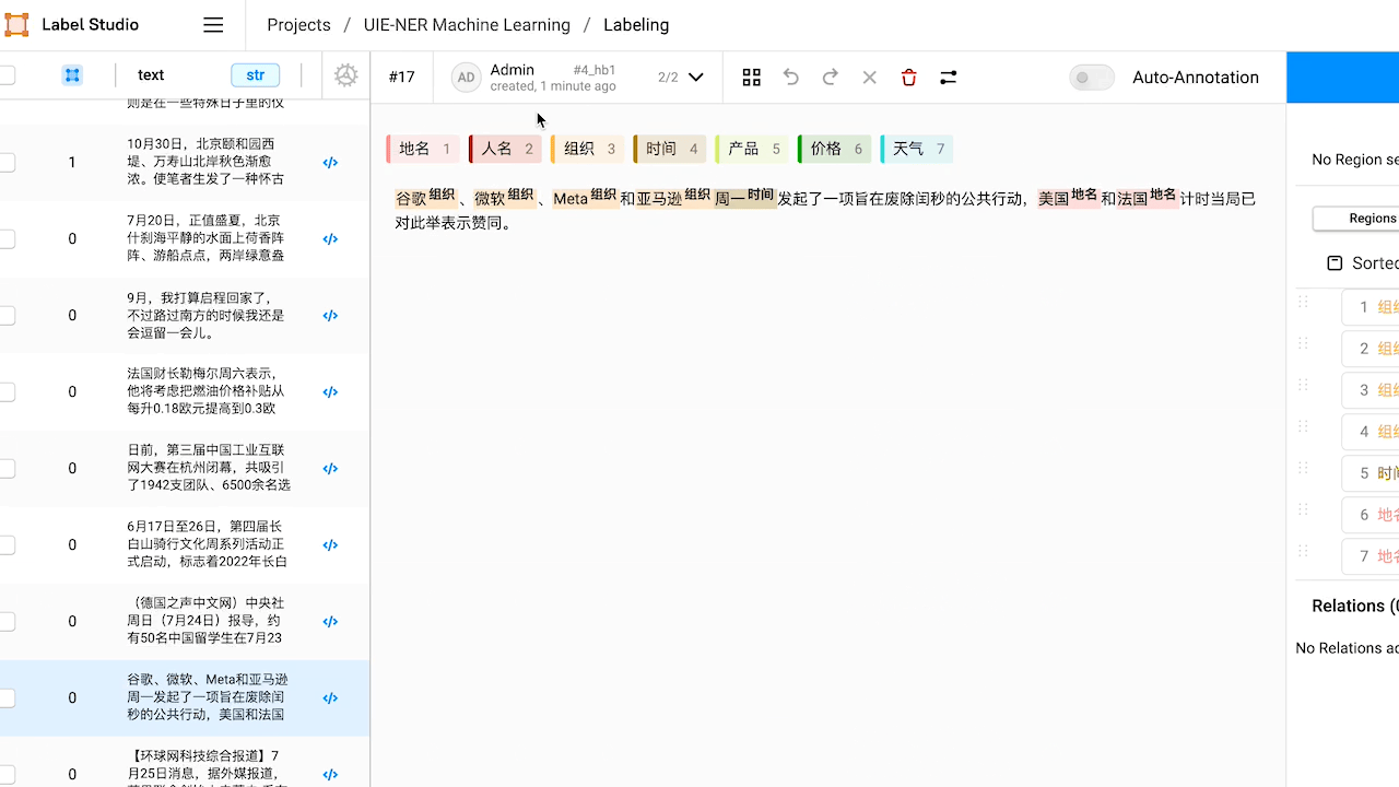 本教程在 基于 UIE 的命名实体识别 的基础上,进一步通过集成 Label Studio 的 Machine Learning Backend 实现交互式预注释和模型训练等功能。